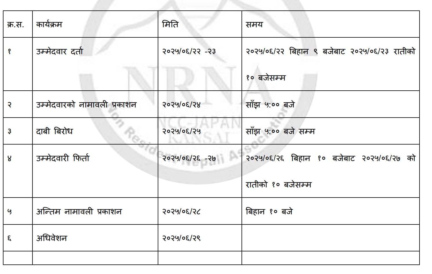 १. गैर आवासीय नेपाली संघ जापान, कान्साई क्षेत्रीय समन्वय परिषद्को २०२५-२०२७ कार्यकालको निर्वाचन कार्यक्रमको विवरण यस प्रकार रहेको छ ।